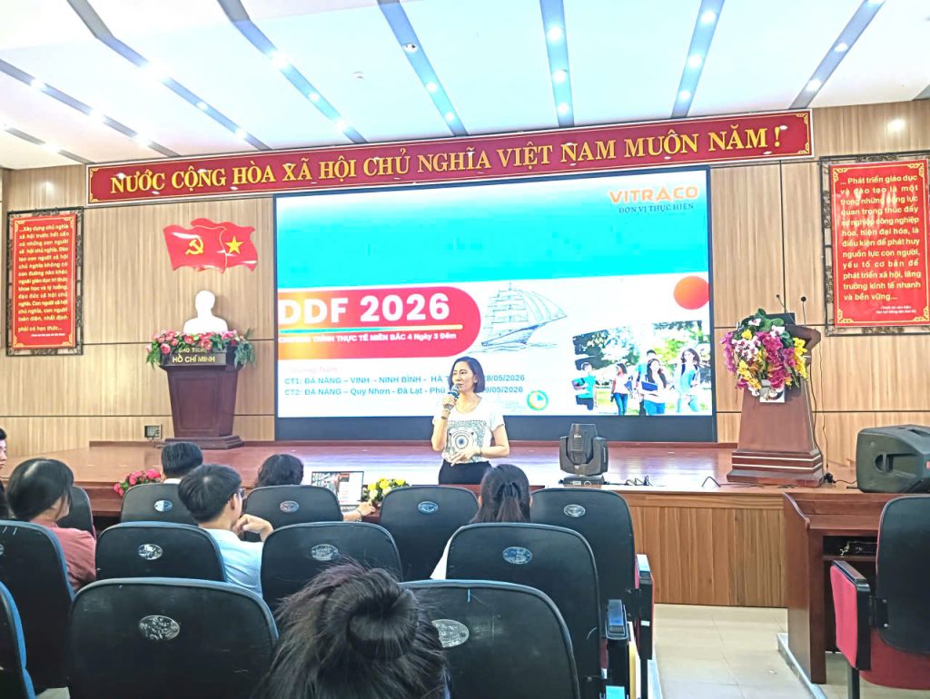 Đại diện đơn vị VI.TRA.CO đã trình bày cụ thể về các phương án tổ chức chuyến đi năm nay, bao gồm lịch trình di chuyển, điểm tham quan, điều kiện lưu trú và những lưu ý quan trọng trong suốt hành trình. Các lựa chọn điểm đến được thiết kế đa dạng, phù hợp với nhu cầu và định hướng học tập của sinh viên.